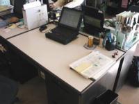 - 初公開かしら?会社で座っている私の机。PC1台、溜まった仕事の書類、ペン立て、コーヒー、電話の充電器、お菓子のおまけ(ガンダム)、名刺入れしか無いッス。基本的に業務系の資料は電子化されているし、紙の資料はキャビネットに閉じちゃうし。唯一の弱点はPCですな。未だにMMX